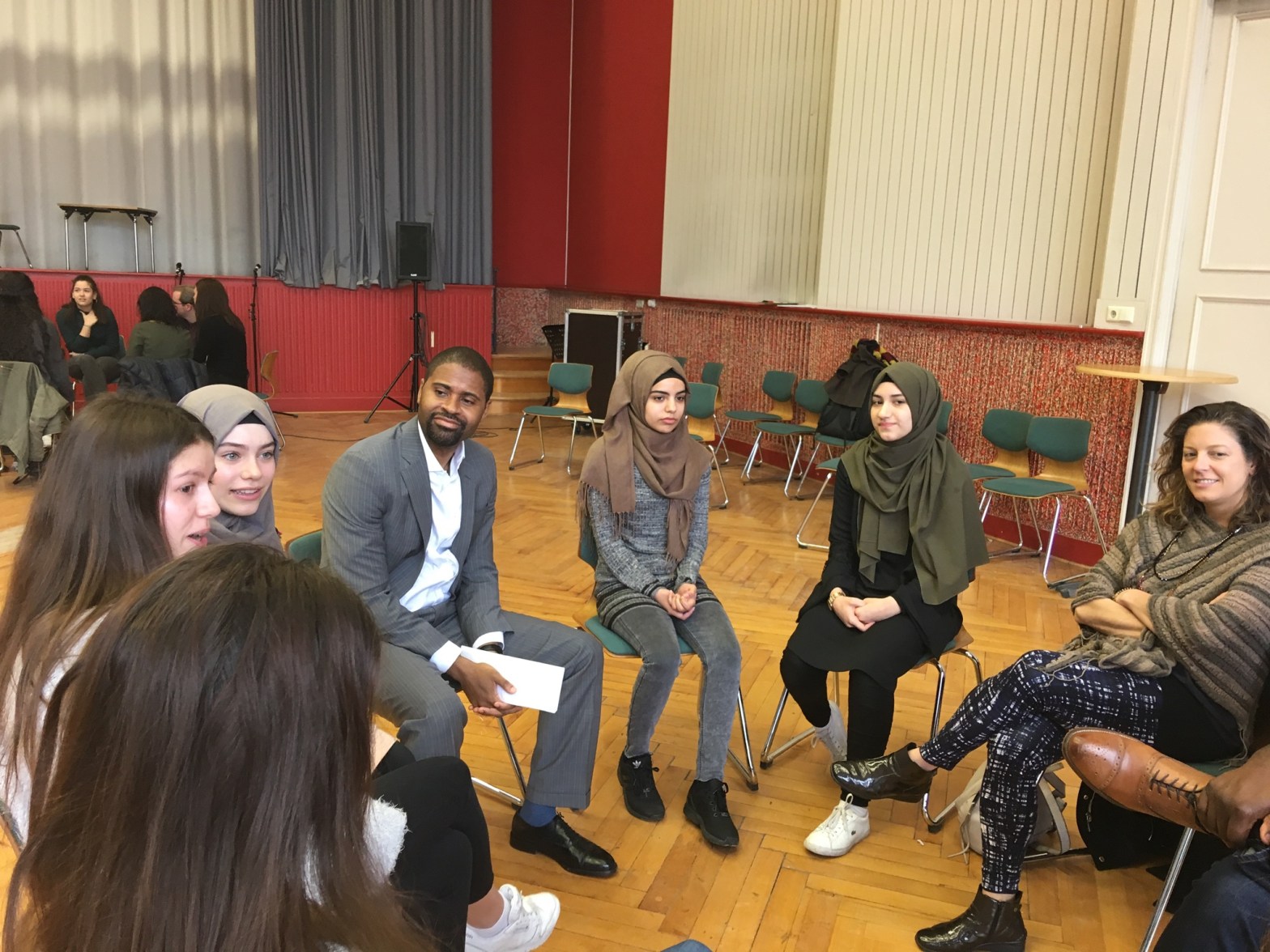 Figure 1. American Marshall Memorial Fellows listening to Muslim and immigrant students at Ernst-Abbe-Gymnasium. The school is a safe haven for immigrant children in Berlin. (Photo: Kelwin Harris)